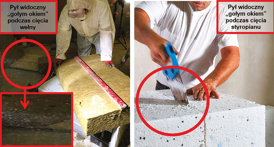 Fot. PSPS: Porównanie emisyjności pyłu podczas docinania (zdjęcia – widoczny pył okiem nieuzbrojonym podczas docinania, po lewej stronie z wełny, po prawej ze styropianu)